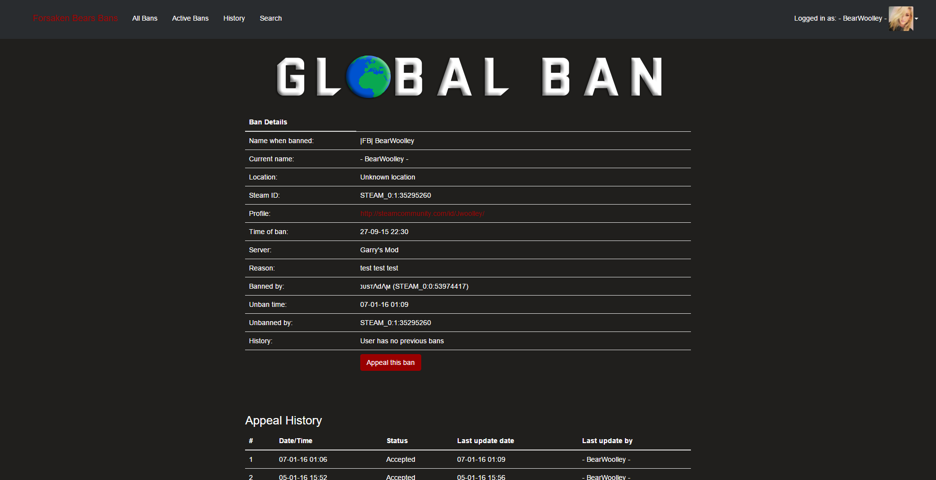 The appeal system is built in to the Steam API meaning bans show latest name and profiles from Steam, allowing admins to get a better understanding of who the player was. This also means that only the banned player can appeal their ban, admins can then review the appeal and decide if the player should be unbanned or not.