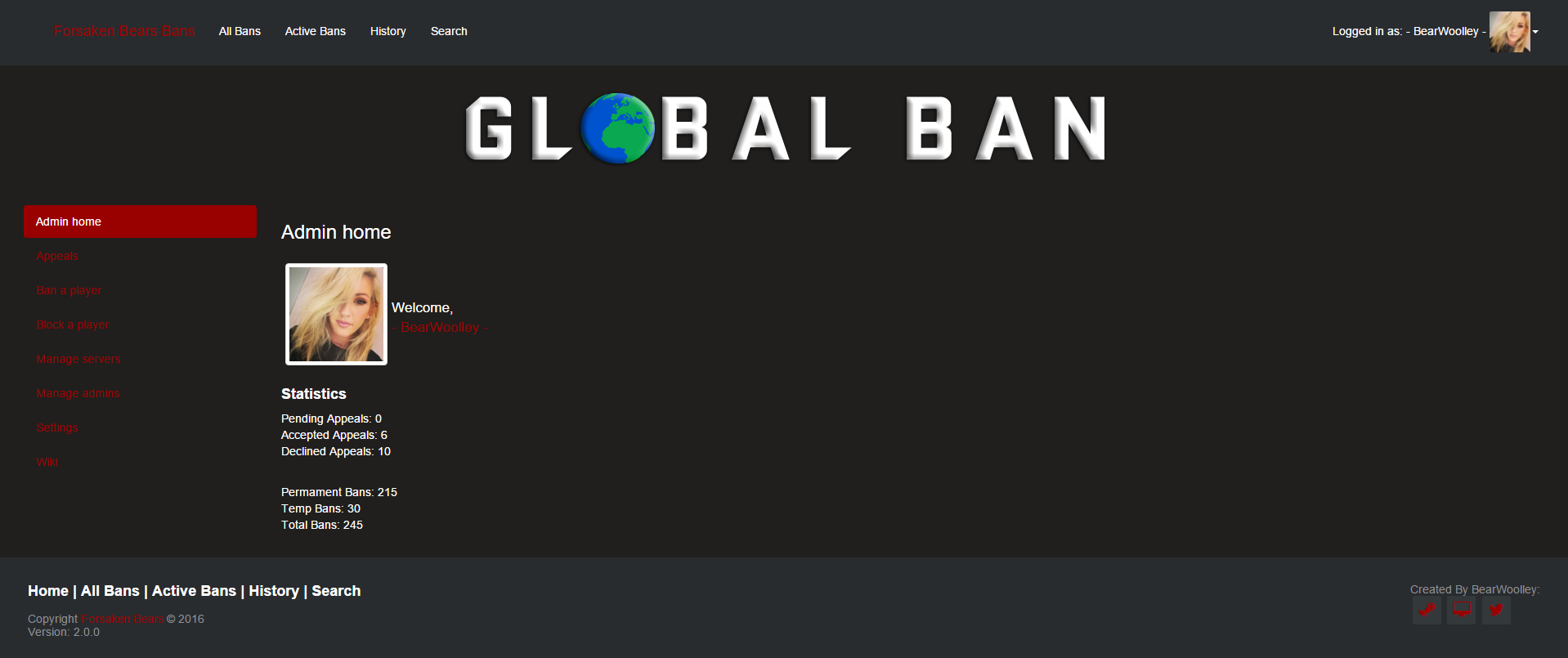 Global Ban is a simple banning solution with a advanced set of features. It is a very light weight and simply solution to banning players and allowing players to appeal their bans.